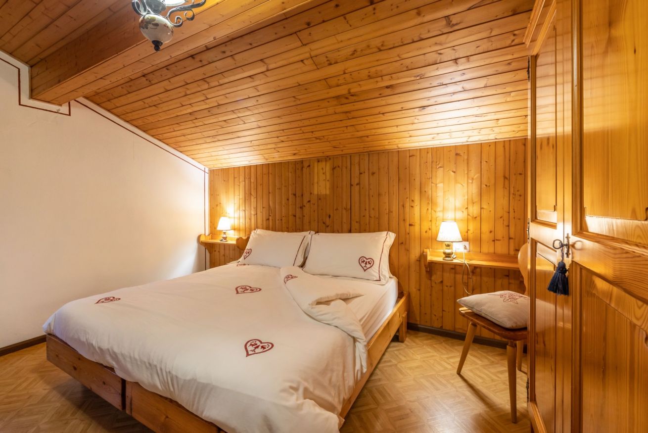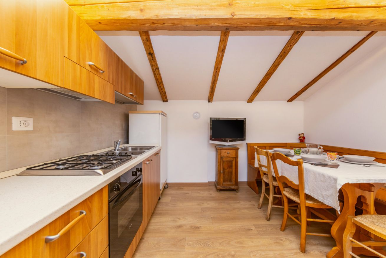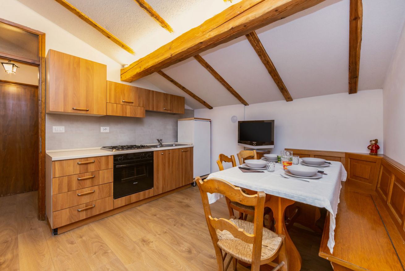 Appartamento trilocale mansardato da 50 m² composto da soggiorno con cucina completamente attrezzata, camera con 2 letti separati, camera matrimoniale con la possibilità di aggiungere un terzo letto, bagno con doccia, biancheria da letto e da bagno e balcone con vista sulle montagne.