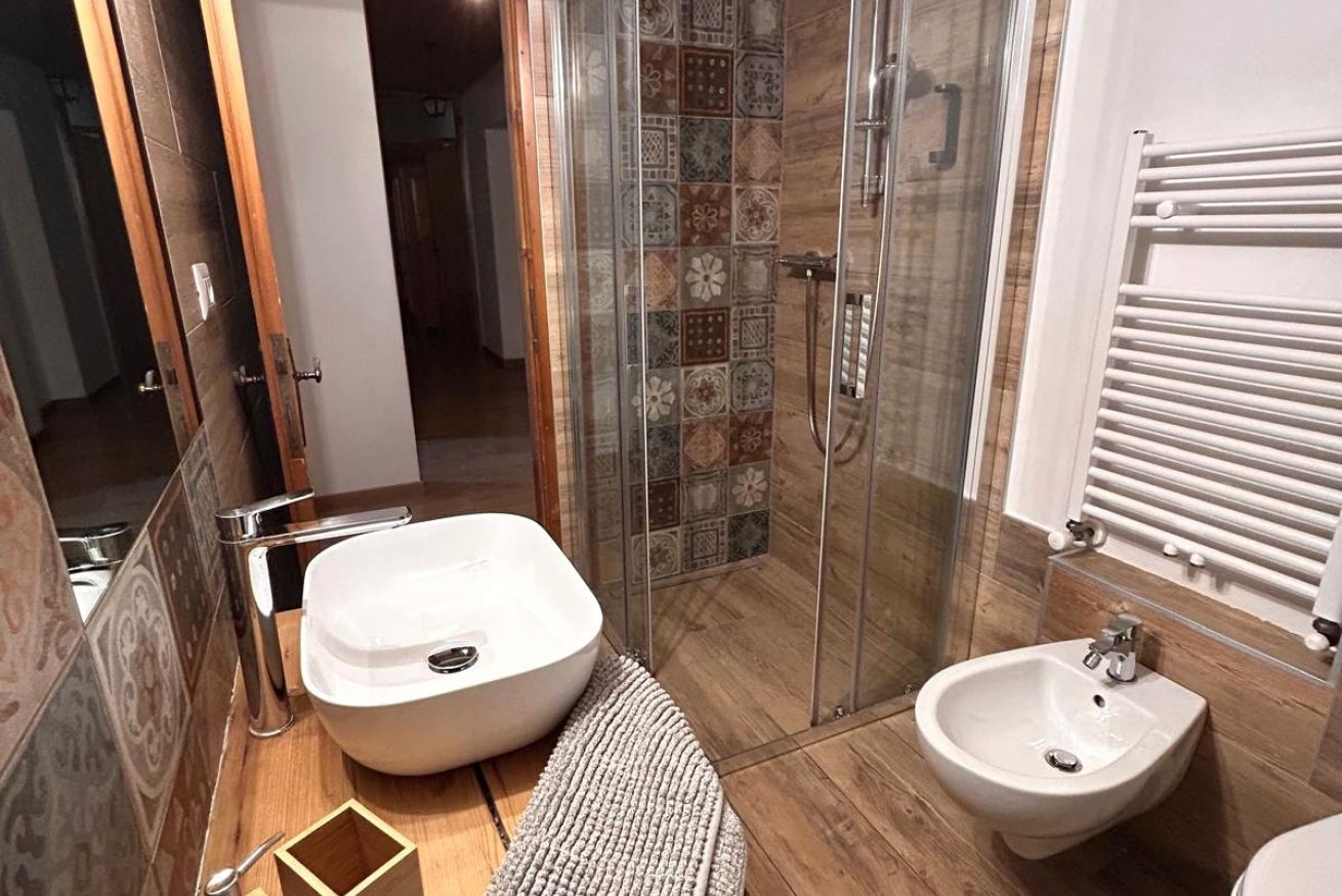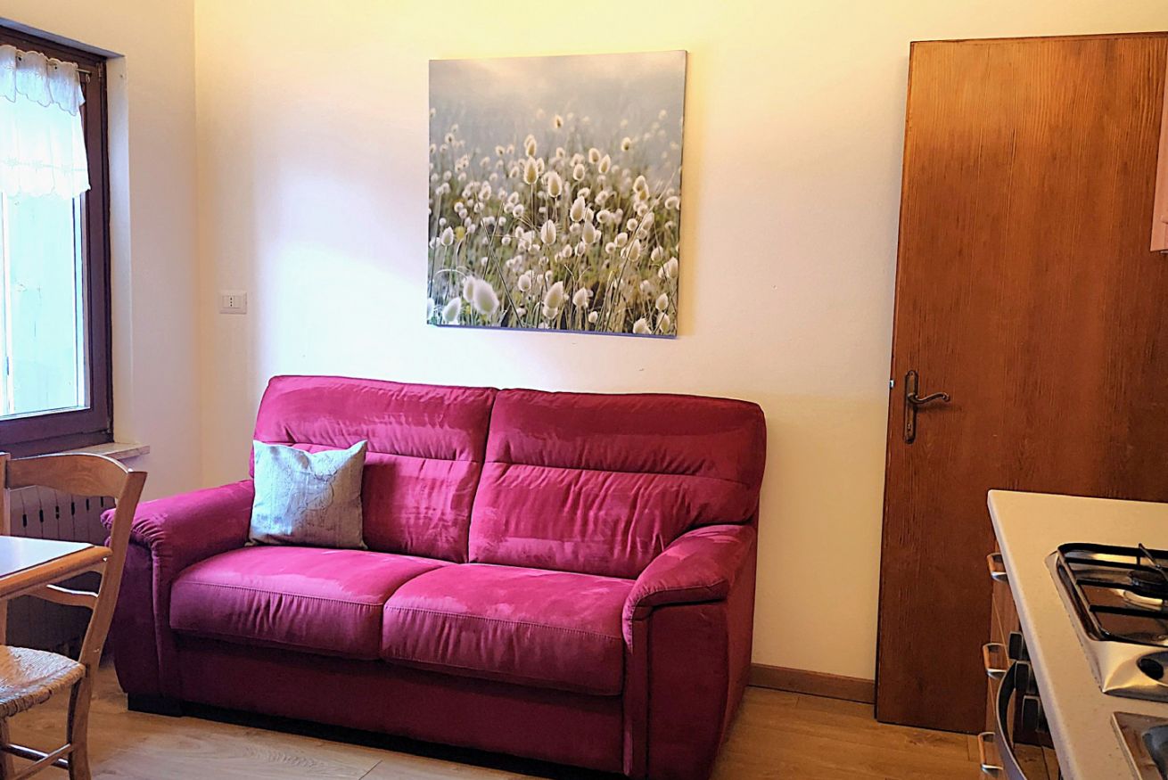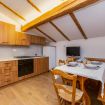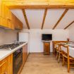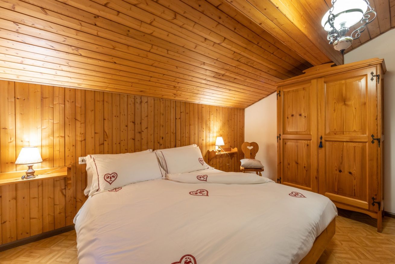 Appartamento trilocale mansardato da 50 m² composto da soggiorno con cucina completamente attrezzata, camera con 2 letti separati, camera matrimoniale con la possibilità di aggiungere un terzo letto, bagno con doccia, biancheria da letto e da bagno e balcone con vista sulle montagne.